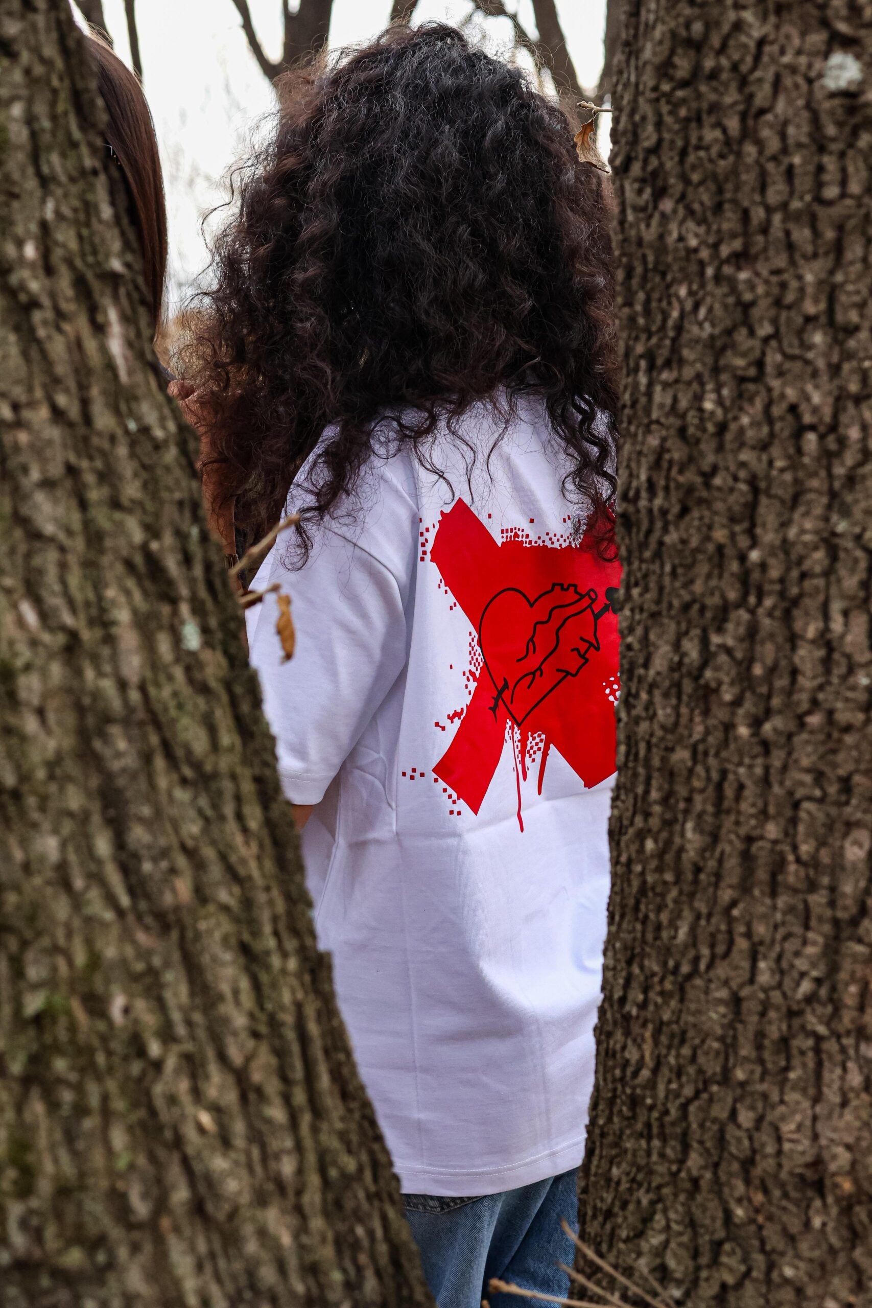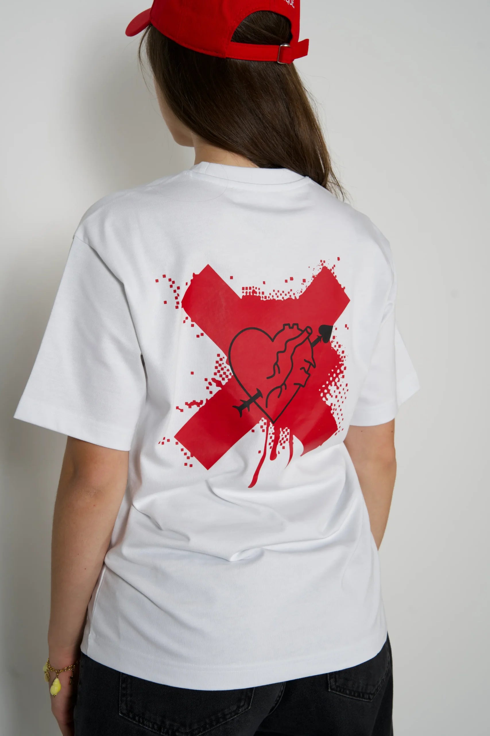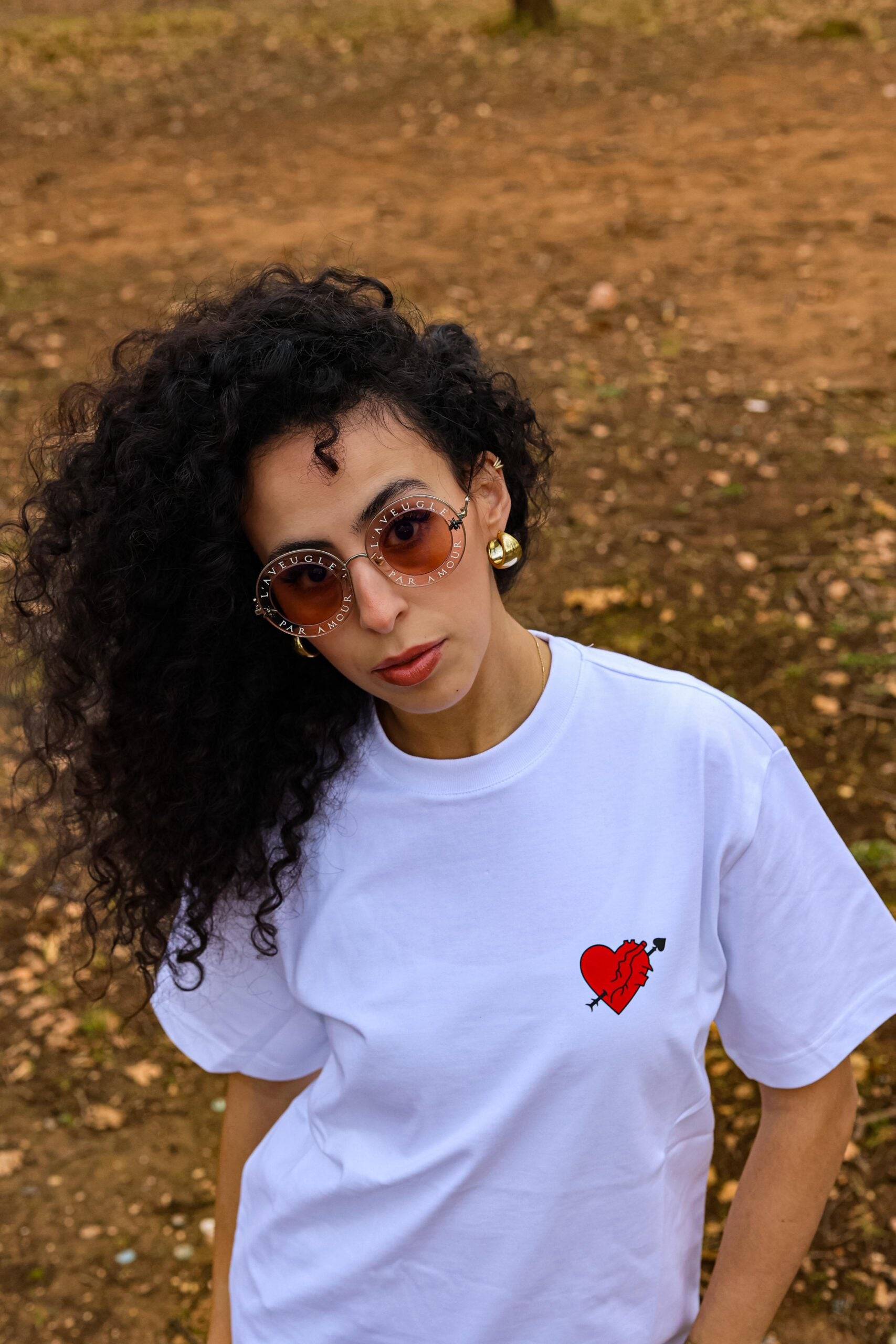 Issues de la collection Homme / Femme été 2025, les pièces de prêt-à-porter du quotidien sont sublimées par des matériaux de qualité supérieure et bénéficient d’un savoir-faire impeccable. Ce t-shirt est confectionné en jersey de coton feutré épais blanc , flocage coeur devant et coeur dans le dos.